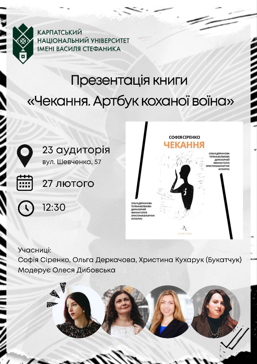 27 лютого о 12:30 у 23 аудиторії ЦК відбудеться презентація книги "Чекання. Артбук коханої воїна". ...