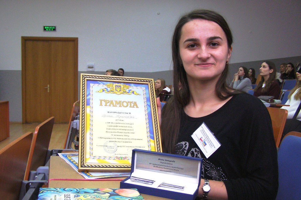 Iryna Herasymiuk, a fourth-year student from Precarpathian University who majors in Polish Language and Literature, became the winner of the XIV Ukraine’s National Contest in Polish Orthography. The student was prepared for the contest by Mariana Skrypnyk, who teaches at the Department of Slavic Languages.