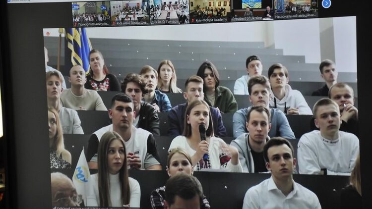 “Я справді радий можливості поспілкуватися сьогодні з вами й сподіваюся, що це буде саме спілкування. Не лекція чи семінар, яких, упевнений, вам і так вистачає. Мені хотілось би побудувати з вами діалог, тому у своєму виступі я поставлю запитання, і мені цікаво почути відповіді від кожної й кожного, хто забажає. Від вас”, – окреслив Володимир Зеленський формат спілкування і поставив цілу низку запитань.
