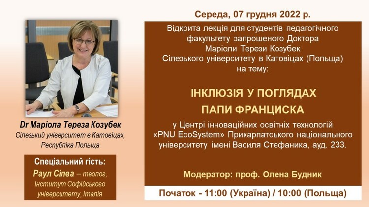 07 грудня (середа) у Центрі інноваційних освітніх технологій «PNU EcoSystem» Прикарпатського національного університету імені Василя Стефаника (ауд. 233 ц.к.) відбудеться відкрита лекція запрошеного Доктора Маріоли Терези Козубек Сілезького університету в Катовіцах (Республіка Польща) на тему: Інклюзія у поглядах Папи Франциска.