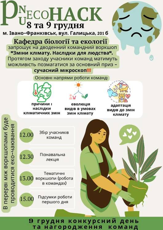 Зимовий «PNUecoHACK» присвячуємо одній з ключових проблем сучасності – зміні клімату: причинам і наслідкам цього процесу, з’ясуванню цікавих фактів про нього і розвінчуванню численних міфів… У рамках дводенної програми заходу, яка поєднає насичені воркшопи і цікаву конкурсну програму, учасники хакатону за допомогою сучасних навчальних технологій і безпосередньої участі у лабораторних практикумах і мініпроєктах самостійно знайдуть відповіді на питання: «що таке «парниковий ефект»? «чи змінювався клімат у минулому і до чого тут еволюція?», «чи адаптуються живі організми до змін клімату?», «що таке кліматична політика і стратегія?», «у чому небезпека «видів-чужинців» і як з ними боротися або як пов’язані амброзія та ООН?», «Зміна клімату: запобігти не можна адаптовуватися! Постав кому правильно!…