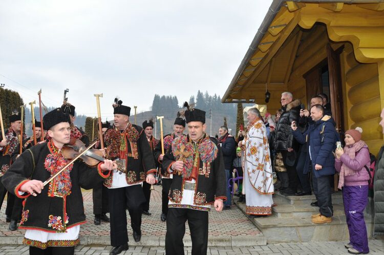 Після Служби Божої на подвір’ї церкви велично заколядували місцеві жителі у традиційному гуцульському вбранні. Цікаво те, що на Гуцульщині колядують в колядницьких партіях тільки чоловіки. До Йордана (19 січня) — час колядницкий. Чоловіки ритмічно підкидають догори бартки і пританцьовують на місці. Кожен їх рух супроводжує перегук дзвоників. Усе разом — скрипка, голоси, переливи дзвіночків, супроводжувані танцювальними рухами, — вичакловує майже містичну атмосферу.