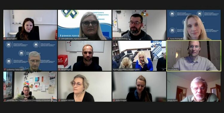 Прикарпатський національний університет імені Василя Стефаника представляли начальниця науково-дослідної частини університету, доцентка кафедри управління та бізнес-адміністрування Ірина Григорук; директорка Проектно-освітнього центру «Агенти змін», доцентка кафедри фінансів Світлана Кропельницька; фахівчиня Проектно-освітнього центру «Агенти змін», доцентка кафедри фінансів Тетяна Мигович; директор «Науковий парк ПНУ» Роман Бубна; завідувач, професор кафедри фізики і хімії твердого тіла, кандидат фізико-математичних наук, координатор НКП «Нанотехнології, сучасні матеріали та передові промислові виробництва» Любомир Никируй; академік АТН України, доктор технічних наук, професор кафедри хімії Сергій Курта. Від команди Потсдамського Університету онлайн взяли участь керівник Start-up Service Йоганнес Зір (Johannes Zier), менеджерка з міжнародних партнерств Аліса Флюрер (Alisa Fluhrer), менеджерка з навчання підприємництву Аніта Кнаппе (Anita Knappe), міжнародний радник зі стартапів Тілль Вінтген (Till Wintgen), менеджер проекту International Startup Service & International Startup Advisor Тілль Томас Майлінг (Dr. Till Thomas Meiling).