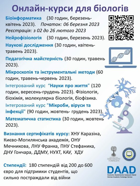 ► Біоінформатика (30 годин, початок у березні 2023). Буде читатися спеціалістами з Львівського національного університету ім. І. Франка та української компанії Explogen (м. Львів). Цей предмет викладають не у всіх українських університетах, але він є одним з найбільш перспективних напрямків для молодих біологів в Європі. Очікувана аудиторія курсу – студенти 4 курсу та старші, аспіранти. З деталями програми та викладачами можна ознайомитись на сторінці нашого проєкту http://lifesciencescourse.org/kurs-bioinformatyka. Реєстрація буде відкрита з 2 лютого за посиланням: https://lifesciencescourse.utrigg.net/f/Bioinformatics-03-2023