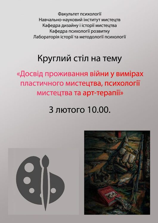 3 лютого 2023 року 0 10.00 розпочне свою роботу міжфакультетський Круглий стіл на тему «Досвід проживання війни у вимірах пластичних мистецтв, психології мистецтва та арт-терапії», до участі в якому запрошуються викладачі, аспіранти, магістри, студенти.