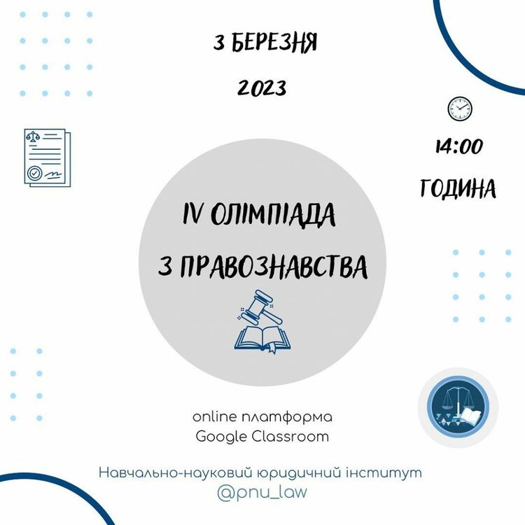 3 березня 2023 року Навчально-науковий юридичний інститут Прикарпатського національного університету імені Василя Стефаника проводить для учнів 9-11 класів IV олімпіаду з правознавства. Вона відбудеться в онлайн форматі на платформі Google Сlassroom.