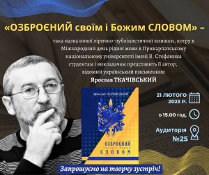 21 лютого о 15:00 у Прикарпатському національному університеті імені Василя Стефаника (ауд. №25) до Дня Героїв Небесної Сотні відбудеться творча зустріч студентів Прикарпатського національного університету ім. Василя Стефаника з відомим українським письменником Ярославом Ткачівським. Ярослав Ткачівський – поет і прозаїк, Читати далі …