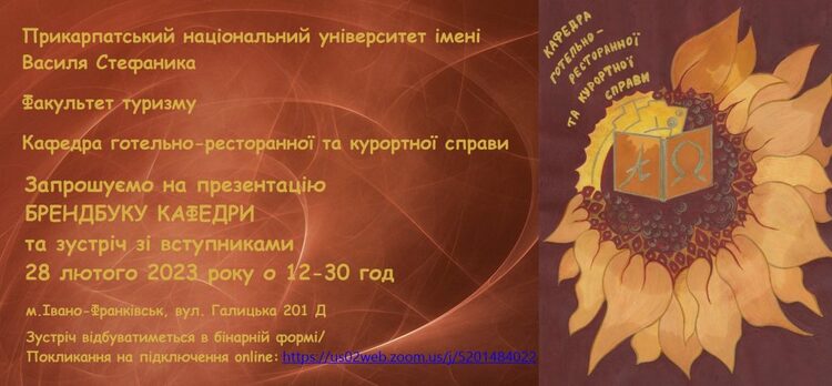 Кафедра готельно-ресторанної та курортної справи Прикарпатського національного університету імені Василя Стефаника запрошує на презентацію БРЕНДБУКУ КАФЕДРИ та зустріч зі вступниками 28 лютого о 12:30 (м. Івано-Франківськ, вул. Галицька 201 Д).
