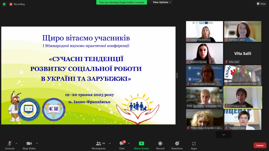19-20 травня на базі Прикарпатського національного університету імені Василя Стефаника відбулася І Міжнародна науково-практична конференція «Сучасні тенденції розвитку соціальної роботи в Україні та зарубіжжі». Захід проведено в онлайн-форматі із застосуванням платформи Zoom. Модератор конференції – кандидат педагогічних наук, доцент, завідувач кафедри соціальної педагогіки та соціальної роботи Іванна Кулик. Перекладачі: Тетяна Близнюк, кандидат педагогічних наук, доцент кафедри початкової освіти, фахівець із використання освітніх інновацій Центру інноваційних освітніх технологій «PNU-EcoSystem»; Наталія Сабат, кандидат педагогічних наук, доцент кафедри соціальної педагогіки та соціальної роботи, учасниця програми академічної мобільності (стипендія Лейна Кіркланда) в університеті Марії Кюрі-Склодовської в Любліні.