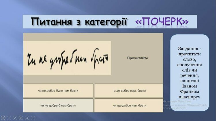 5) категорія «почерк»: завдання – прочитати слово, сполучення слів чи речення, написані Іваном Франком власноруч.