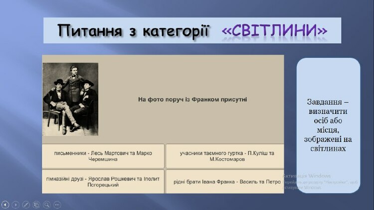 1) категорія «життєпис»: завдання – дати відповідь на питання, пов’язане з життєвим шляхом Івана Франка; 2) категорія «світлини»: завдання – визначити осіб або місця, зображені на світлинах;