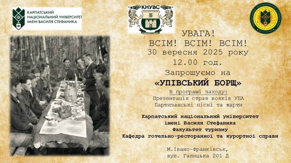 30 вересня о 12:00 год. за адресою: вул. Галицька, 201 Д відбудеться тематичний захід, присвячений заснуванню Української повстанської армії (УПА), Українському козацтву та Дню захисників і захисниць України.