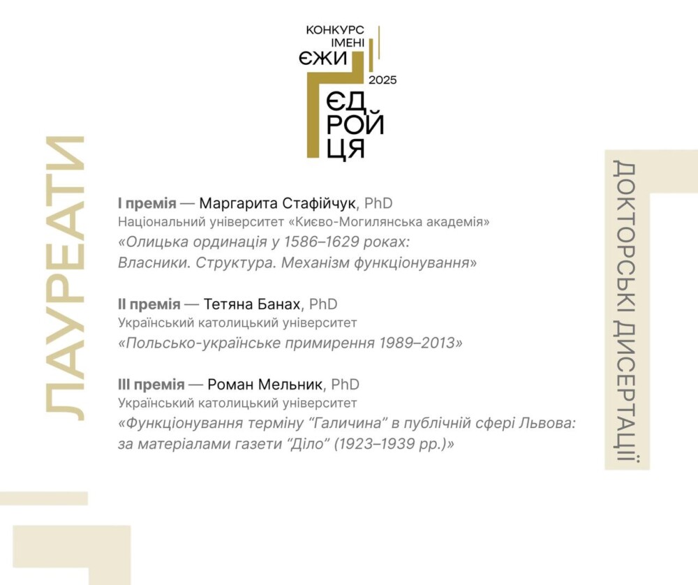 Капітула Конкурсу імені Єжи Ґєдройця присудила премії студентам і молодим українським дослідникам за найкращі бакалаврські та докторські роботи на польську тематику, а також на тему польсько-українських і українсько-польських взаємин. У номінації «Магістерські роботи» цьогоріч переможців немає. Три бакалаврські роботи отримали відзнаки.