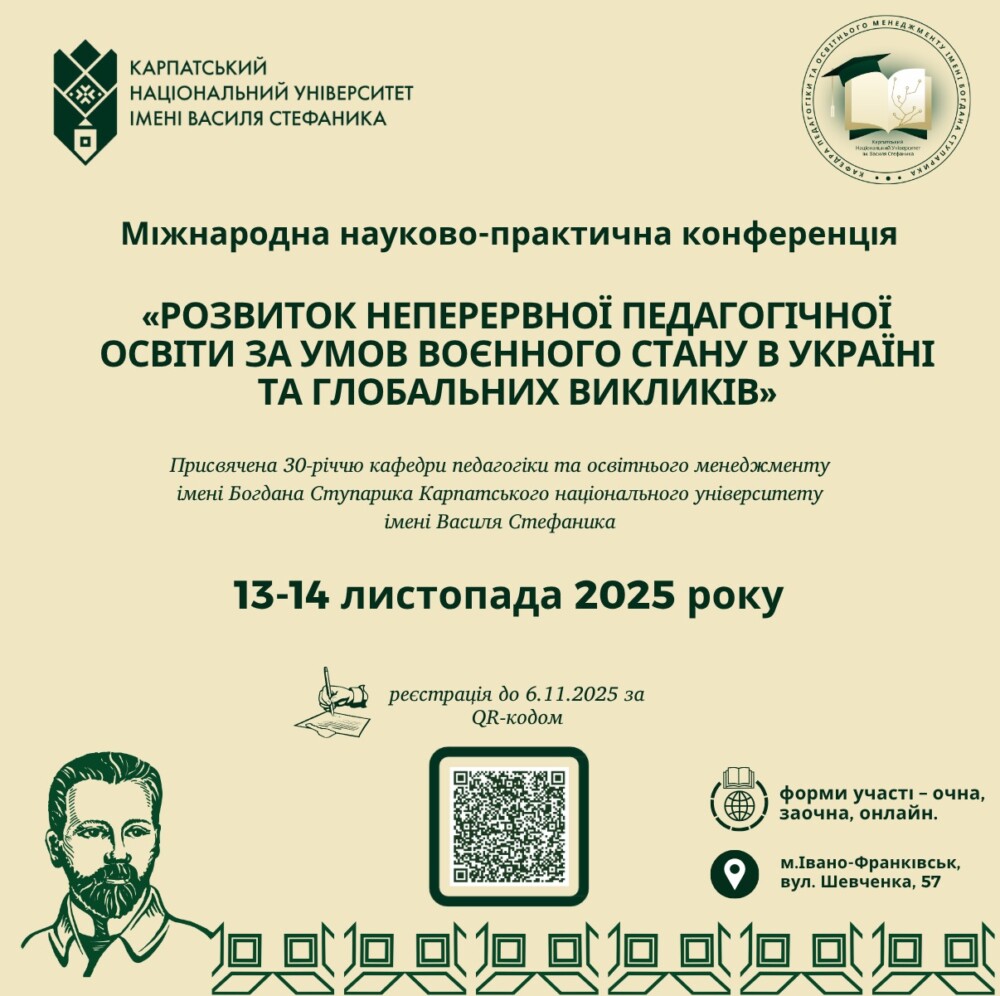 Запрошуємо до участі в Міжнародній науково-практичній конференції «Розвиток неперервної педагогічної освіти за умов воєнного стану в Україні та глобальних викликів» присвячена 30-річчю кафедри педагогіки та освітнього менеджменту імені Богдана Ступарика Карпатського національного університету імені Василя Стефаника.