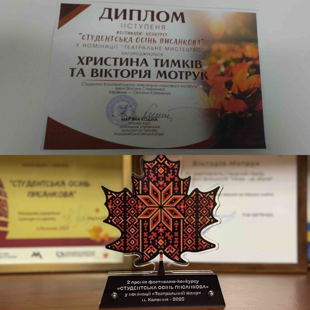 Студентки Коломийського навчально-наукового інституту Карпатського національного університету імені Василя Стефаника, Вікторія Мотрук та Христина Тимків, які навчаються за спеціальністю Середня освіта (Українська мова та література), посіли ІІ місце у номінації «Театральний жанр» у міському конкурсі «Студентська осінь писанкова».