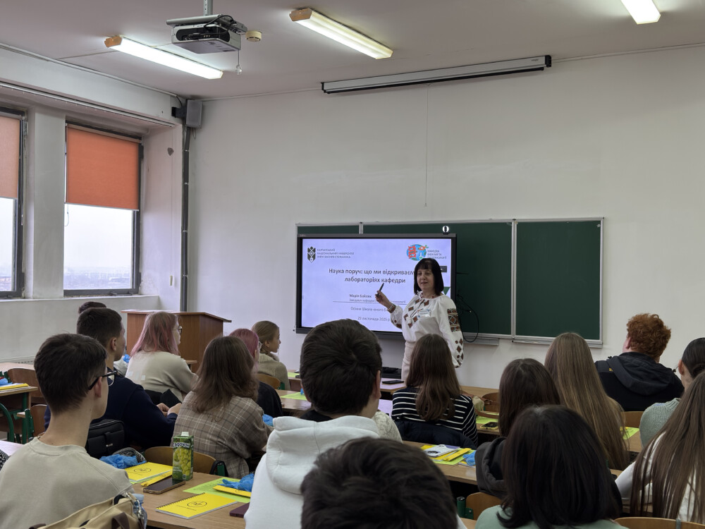 З вітальними словами виступили засновник Школи юного біохіміка професор Володимир Лущак (онлайн) та завідувачка кафедри, професор Марія Байляк, яка також прочитала відкриту лекцію «Наука поруч: що ми відкриваємо в лабораторіях кафедри».