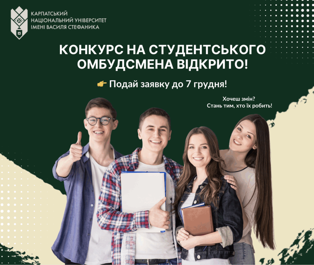 Карпатський національний університет імені Василя Стефаника оголошує конкурс на посаду Студентського омбудсмена – незалежного представника університетської спільноти, який захищає права та інтереси студентів та працівників, підтримує соціальні ініціативи та формує активну громадянську позицію.