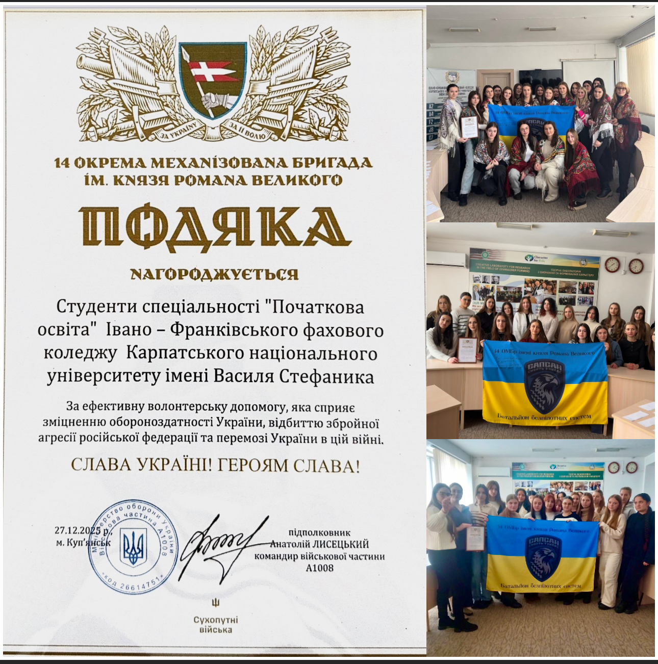Студенти спеціальності 013/A3 «Початкова освіта» Івано-Франківського фахового коледжу Карпатського національного університету імені Василя Стефаника отримали почесну подяку та символічний подарунок — бойовий прапор — від 14 окремої механізованої бригади імені князя Романа Великого.