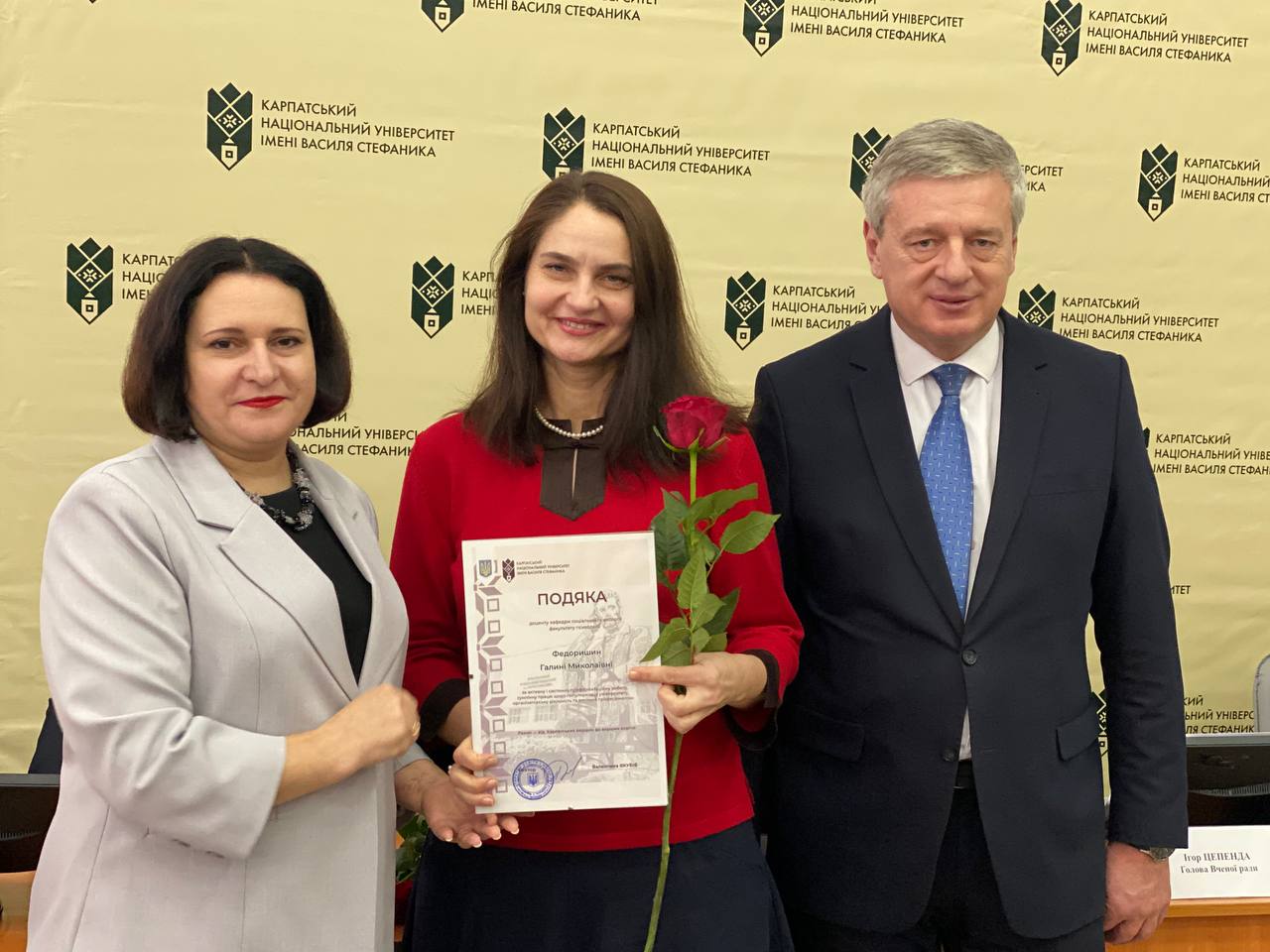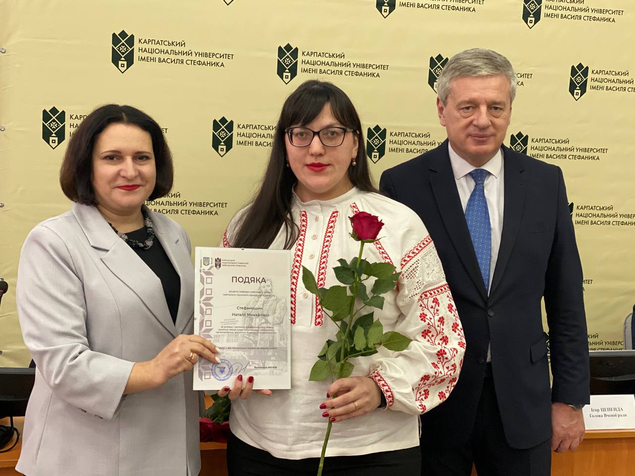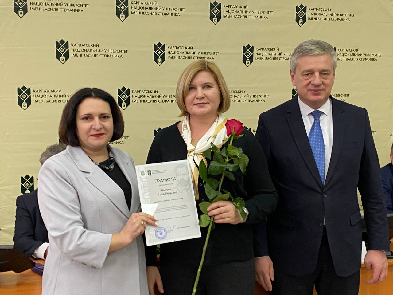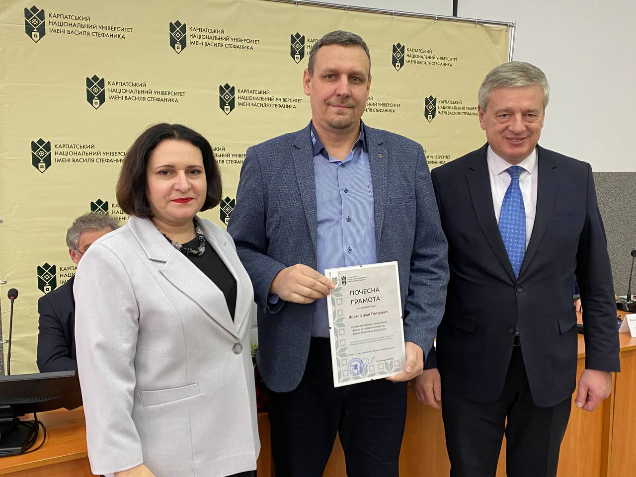 Після цього ректорка університету Валентина Якубів та голова Вченої ради Ігор Цепенда урочисто вручили почесні грамоти Володимиру Розвадовському, Івану Яремію, Омеляну Поплавському, Володимиру Гризі, Катерині Копорх та Івану Благуну.