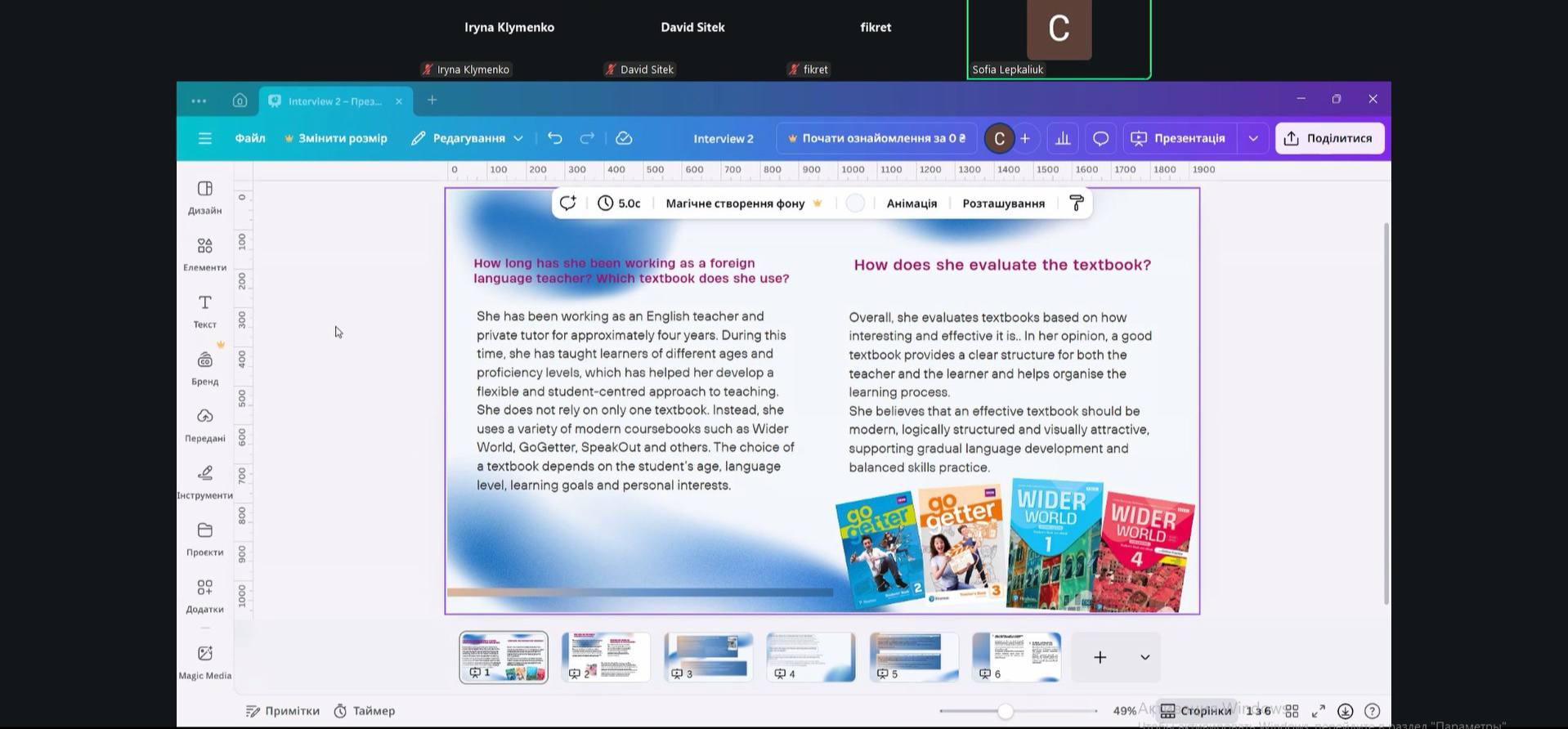 Вікторія Федорка відзначила практичну цінність роботи: «Було цікаво побачити різні освітні траєкторії та підходи до роботи з підручниками. Цей досвід є надзвичайно корисним для мого майбутнього як учительки англійської мови».
