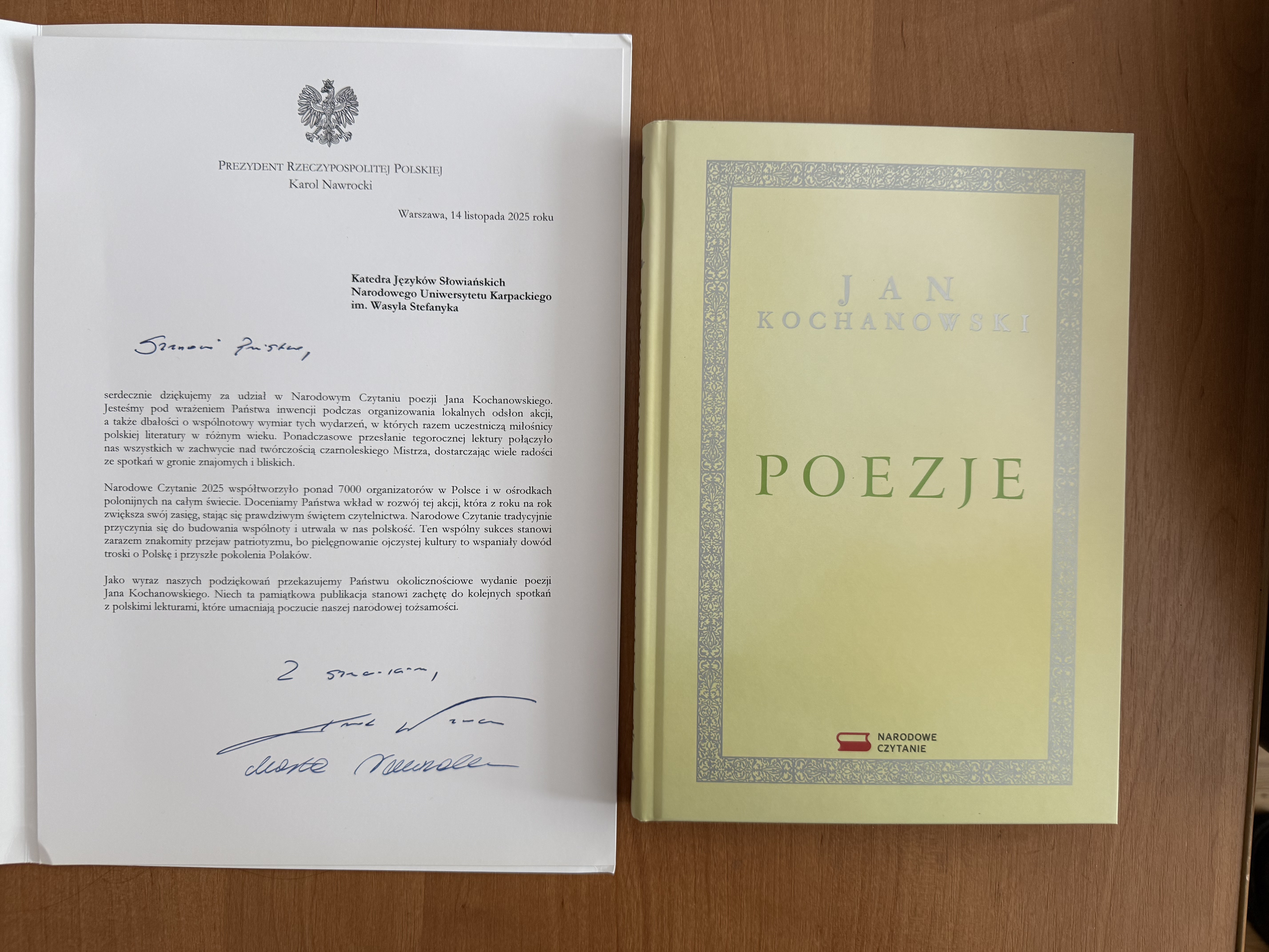 17 лютого кафедра слов’янських мов Карпатського національного університету імені Василя Стефаника отримала офіційну подяку від Президента Республіки Польщі Кароля Навроцького та його дружини Марти Навроцької за активну участь у 14-му щорічному загальнонаціональному культурно-просвітницькому заході «Національне читання – 2025», який відбувся у вересні 2025 року.
