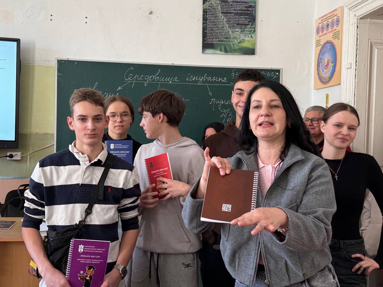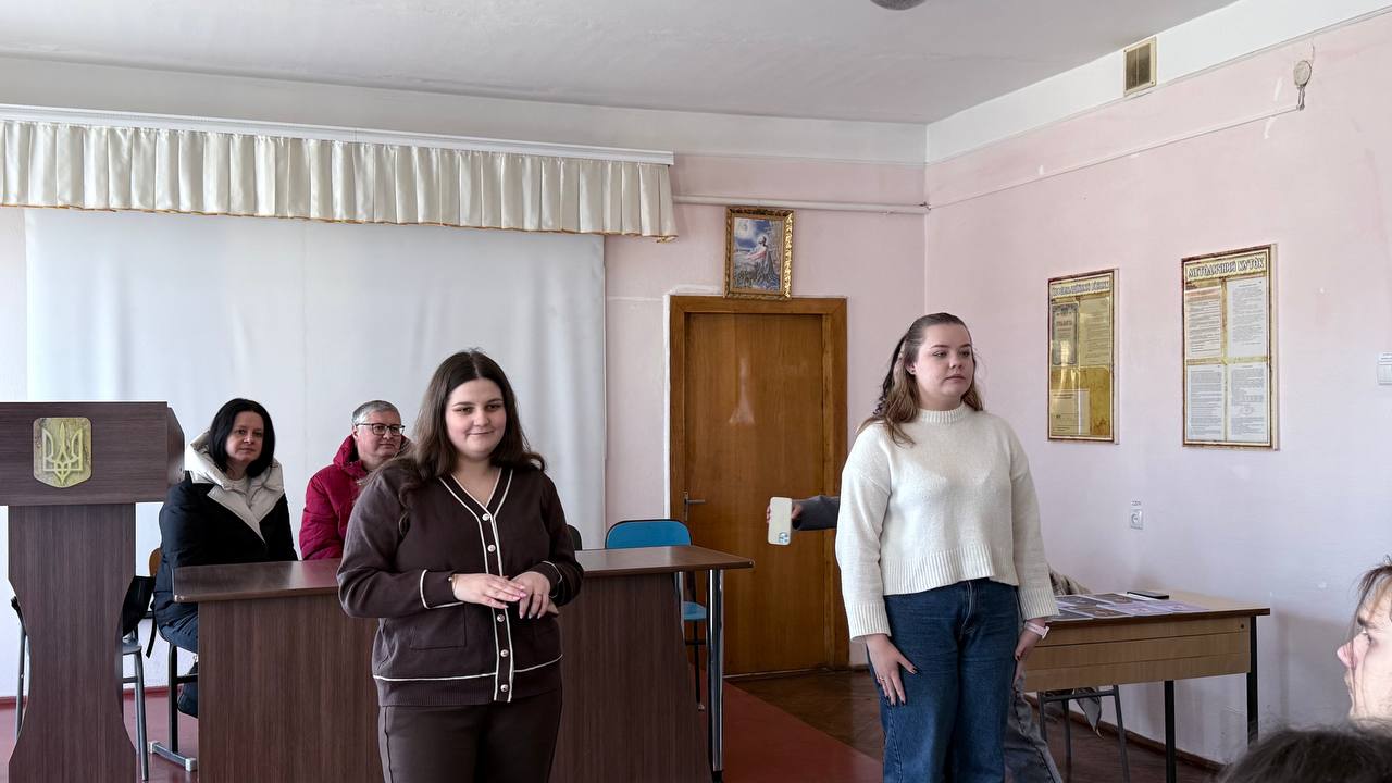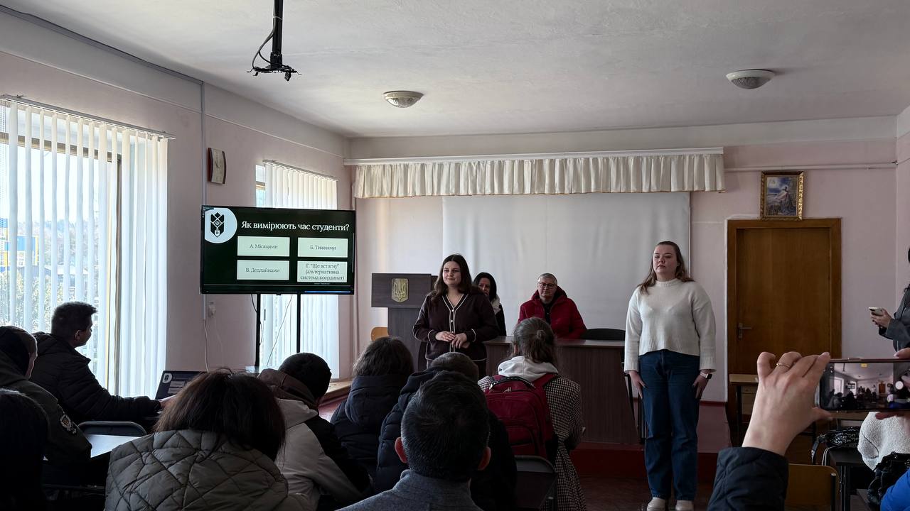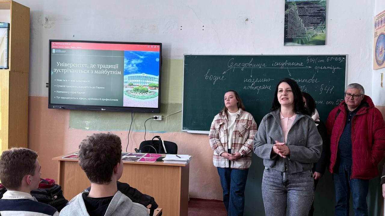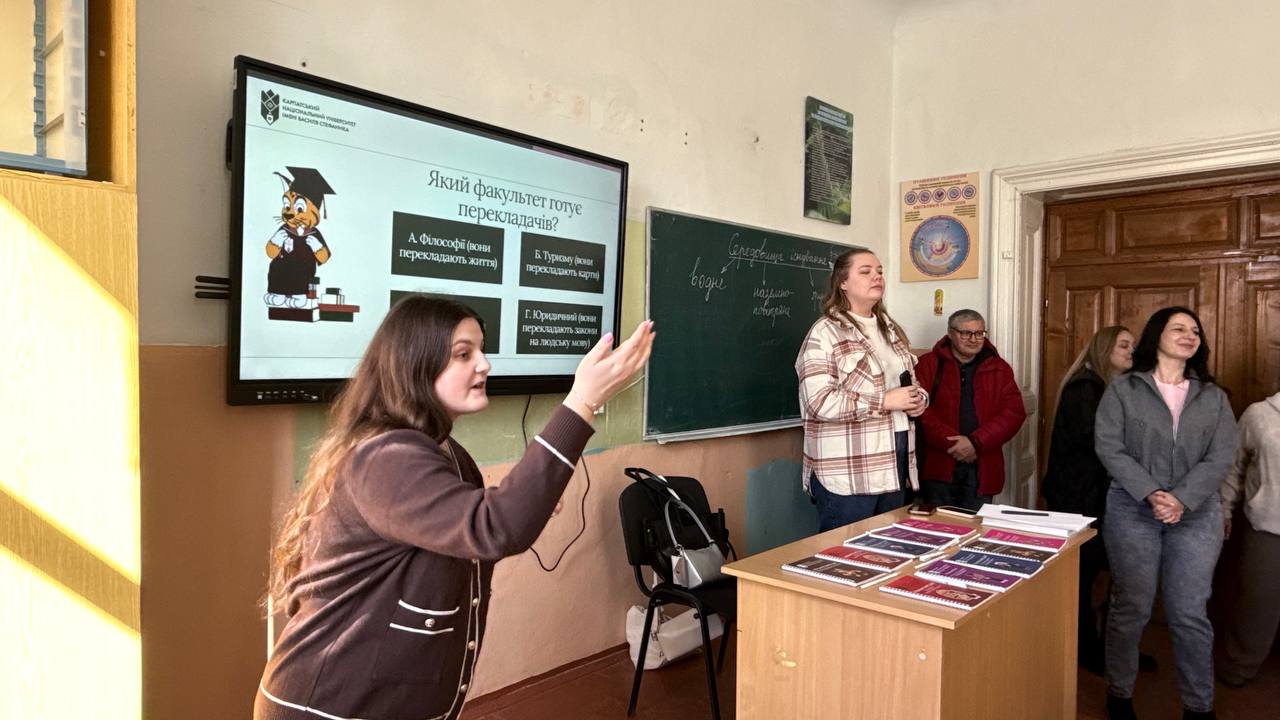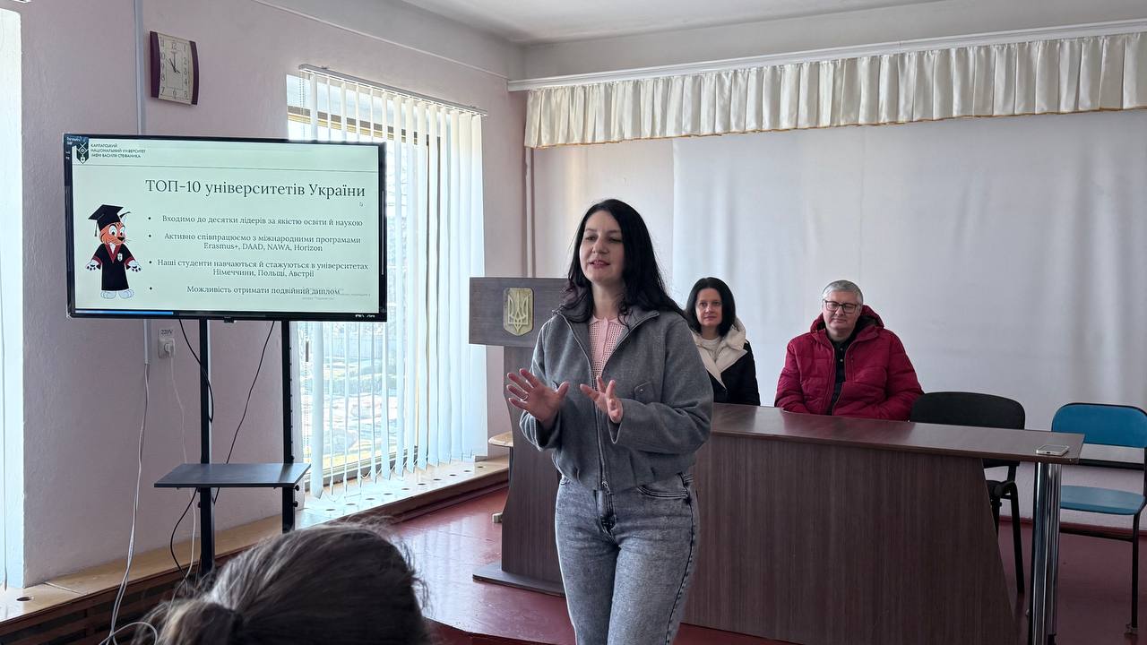 Директорка центру професійної кар’єри та освіти Галина Волощук представила Карпатський національний університет, розповіла про освітні спеціальності, можливості здобуття подвійних дипломів, участь у міжнародних програмах. Інтерактивний елемент до зустрічі додали івент-менеджерки центру Мар’яна Данилюк та Ірина Воробець.