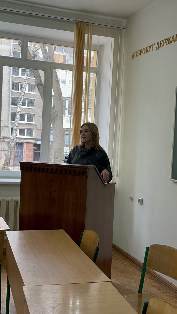 Представники студентського самоврядування — Марта Гамалюк, Софія Притула, Марина Сорич, Юлія Стрипа — презентували здобувачам освіти діяльність Сенату та Профкому студентів навчально-наукового юридичного інституту.