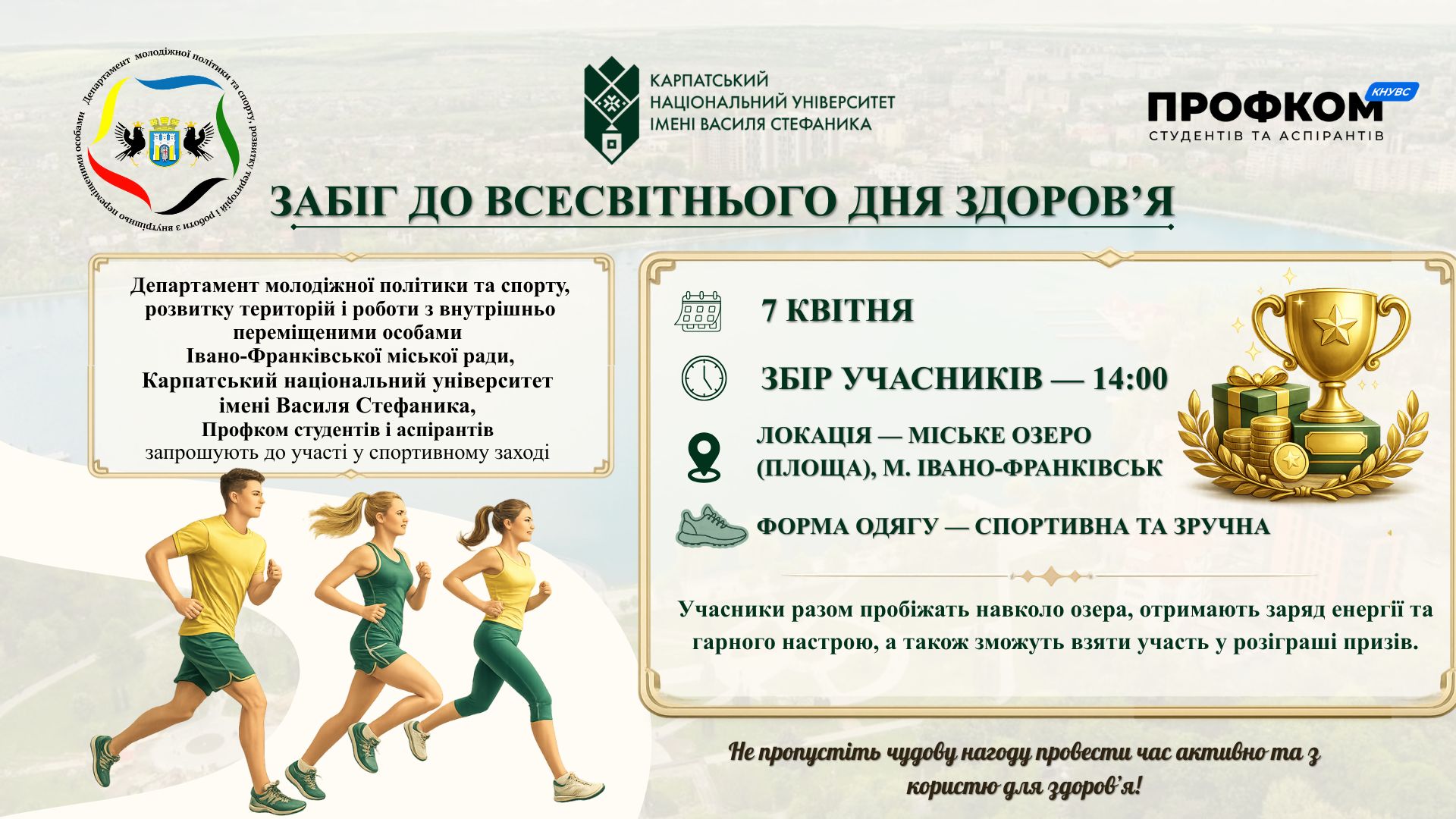 Карпатський національний університет імені Василя Стефаника, Профком студентів і аспірантів та Департамент молодіжної політики та спорту, розвитку територій і роботи з внутрішньо переміщеними особами Івано-Франківської міської ради, запрошують до участі у спортивному заході «Забіг до Дня здоров’я».