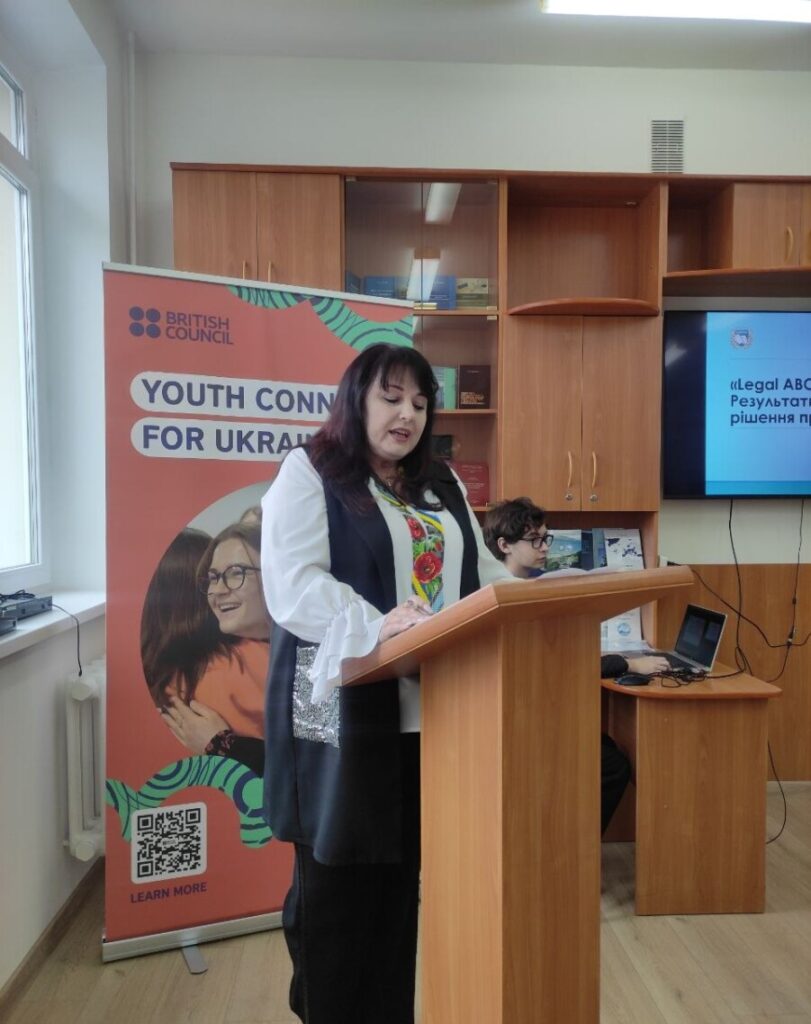 Ірина Малиновська – директорка ГО «Агентство з розвитку приватної ініціативи», викладачка коледжу, представила ключові результати проєкту у темі: «Підвищення правової обізнаності учнів 8–9 класів через систему інтерактивних тренінгів: охоплення, динаміка знань, зворотний зв’язок від учасників освітнього процесу».