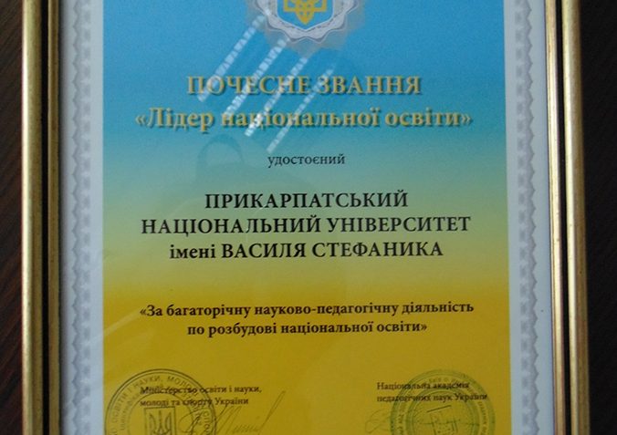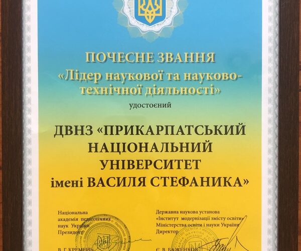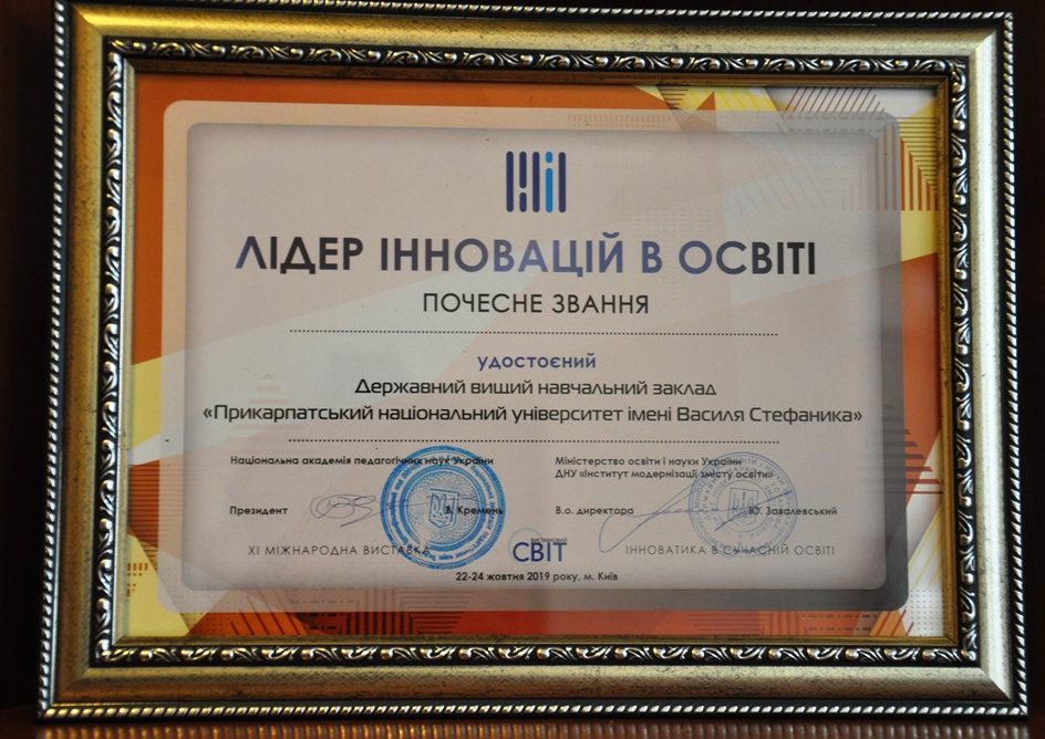 Диплом про присвоєння почесного звання «Лідер інновацій в освіті 2019»