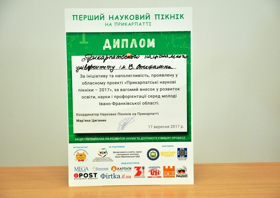 Диплом учасника першого наукового пікніка на Прикарпатті